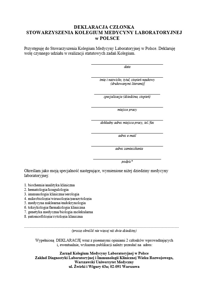 - Posiada specjalizację w jednej z dziedzin medycyny laboratoryjnej i złoży do Zarządu Kolegium pisemną deklarację wraz z pisemną opinią dwóch członków wprowadzających